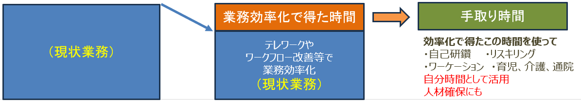 テレワークを行うことで、通勤に掛かる往復時間など、新たに創出した時間を他の事柄に使用することができます。例えば、仕事の作業時間、創造時間、自分時間などに使うことができますが、皆様はどの様にこの時間を使っていますか。